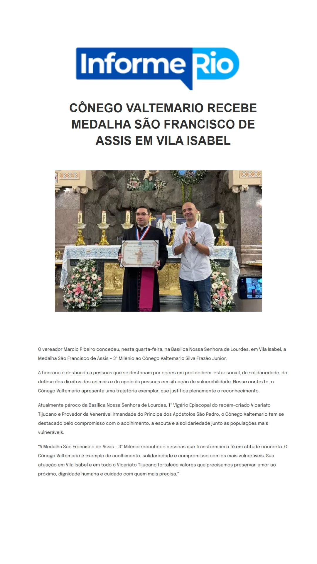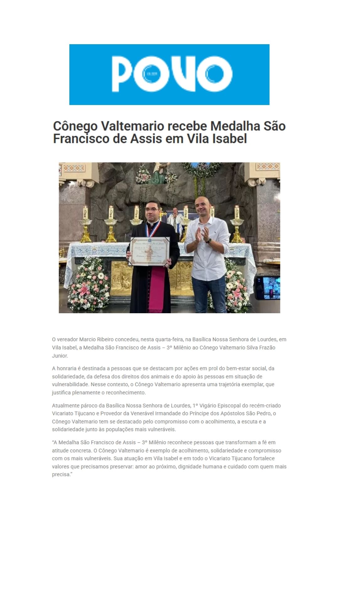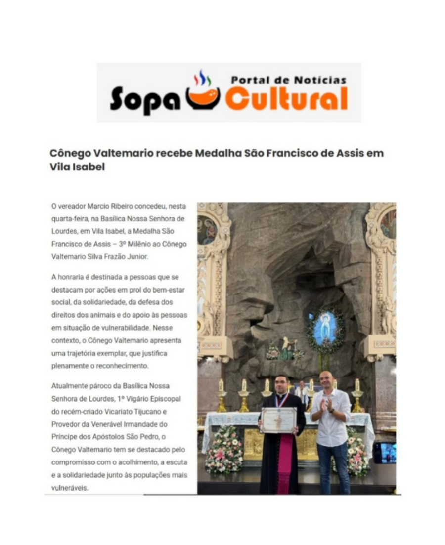 Cônego Valtemario recebe Medalha São Francisco de Assis em Vila Isabel